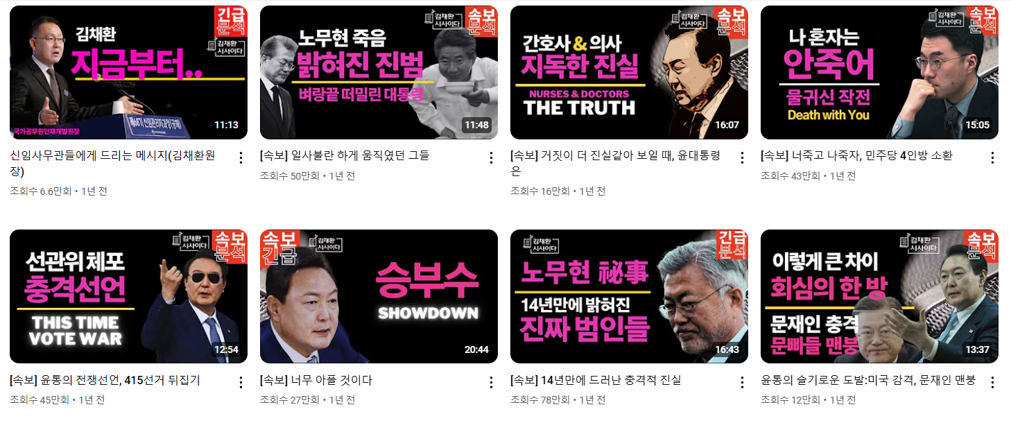 이와 같은 영상들은 김채환이 그동안 개인 유튜브 채널에서 다뤘던 정치적 주제와 자극적인 썸네일 디자인을 그대로 이어받은 것으로 보였습니다.