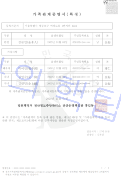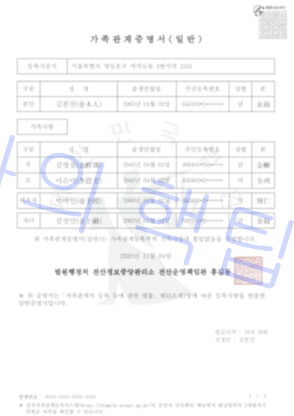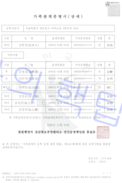 가족관계증명서는 본인과 배우자, 자녀, 부모등 가족관계를 증명하는 서류입니다. 가족관계등록부에 기록된 사항을 증명하는 서류로 가족관계의 발생 및 변동에 관한 사항이 기재되어 있습니다.