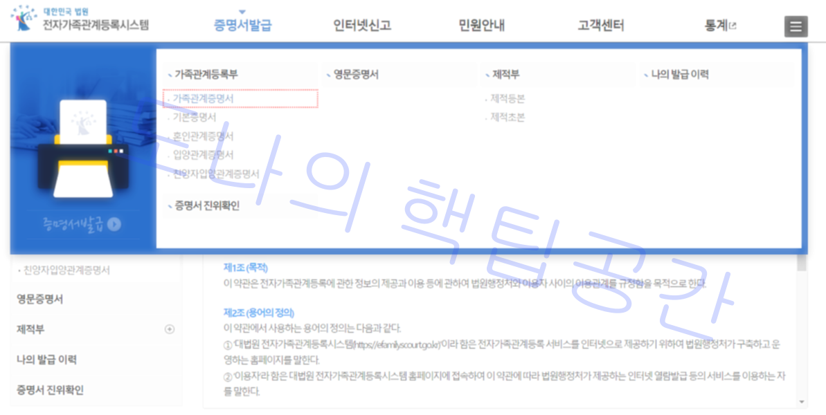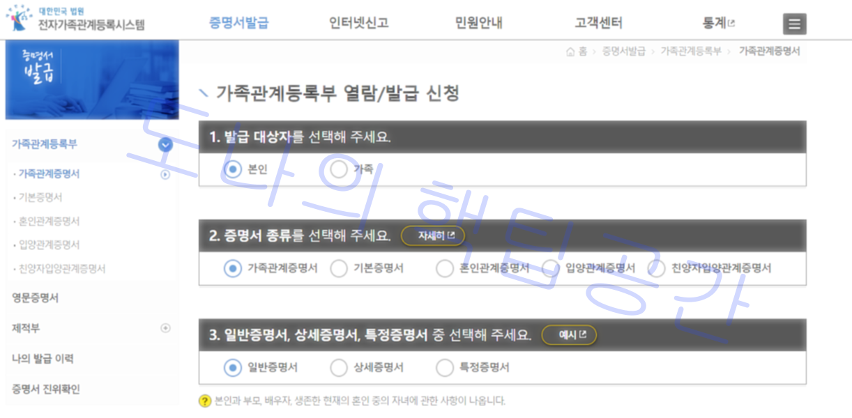 클릭하시면 하단에 가족관계증명서 발급 코너가 있습니다.