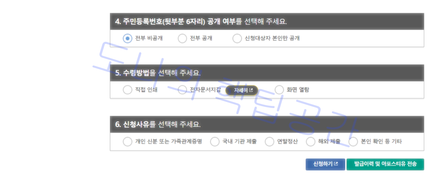 4. 발급대상자와 증명서 종류, 명세서 종류, 주민번호 공개여부, 수령방법, 신청사유등을 해당 사항에 맞세 선택하시면 됩니다.