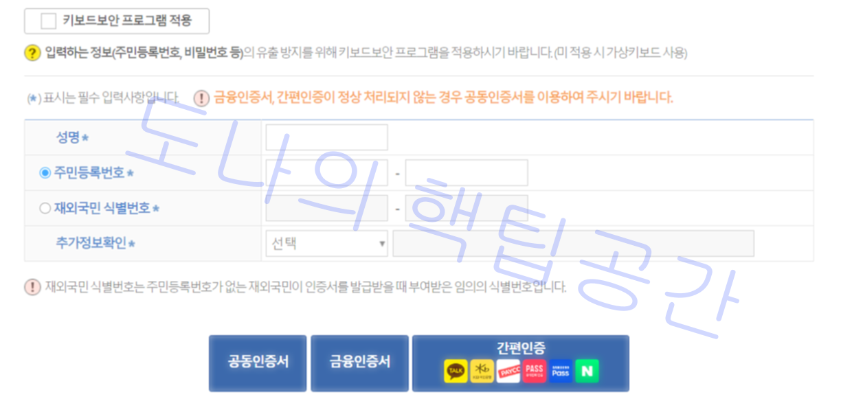공동인증서란 카카오톡이나 네이버등을 통해서 공인인증서를 대신하여 편리하게 사용할 수 있게 만든 제도입니다. 준비가 안되어 있다면 먼저 공동인증서를 준비하셔야 합니다.