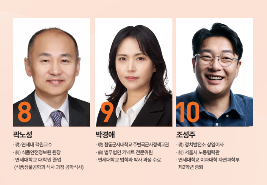 비례대표8번은 곽노성 전 식품안전정보원장입니다. 1969년생으로 연세대학교 대학원을 졸업하고 식품안전정보원 원장등을 지냈습니다.