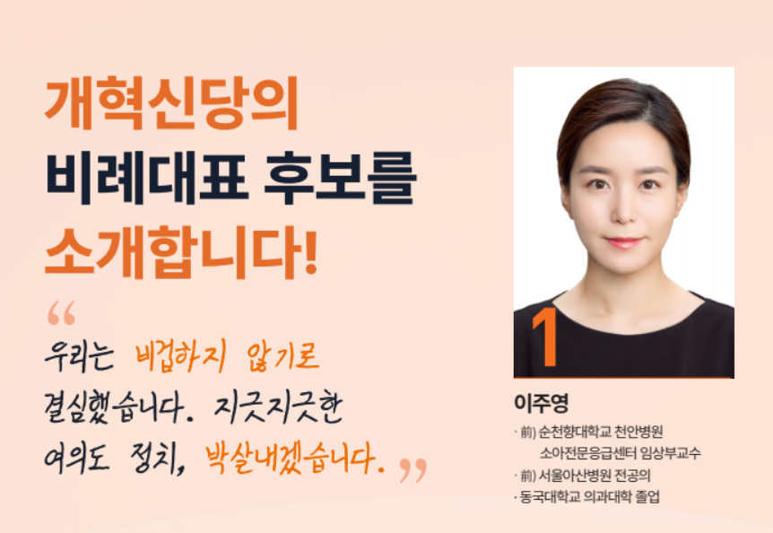 비례대표 1번은 이주영 전 순천향대 천안병원 소아응급과 교수입니다. 1982년생으로 올해 42세이며 울산대학교 대학원 의학석사로 졸업하였으며 순천향대학교 천안병원 임상부교수등의 경력이 있습니다.