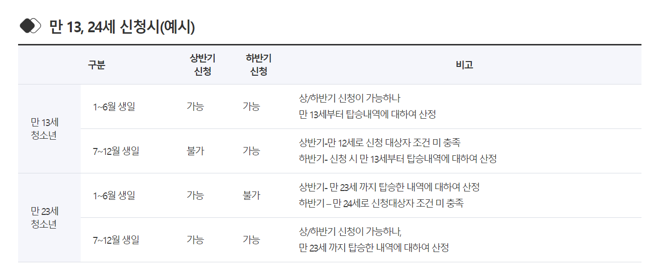 신청대상자 생년월일은 1999. 01. 02. ~ 2010. 06. 30가 그 대상자입니다. 단 만12, 24세에 탑승한 실적은 지원 불가하니 참고하시기 바랍니다.