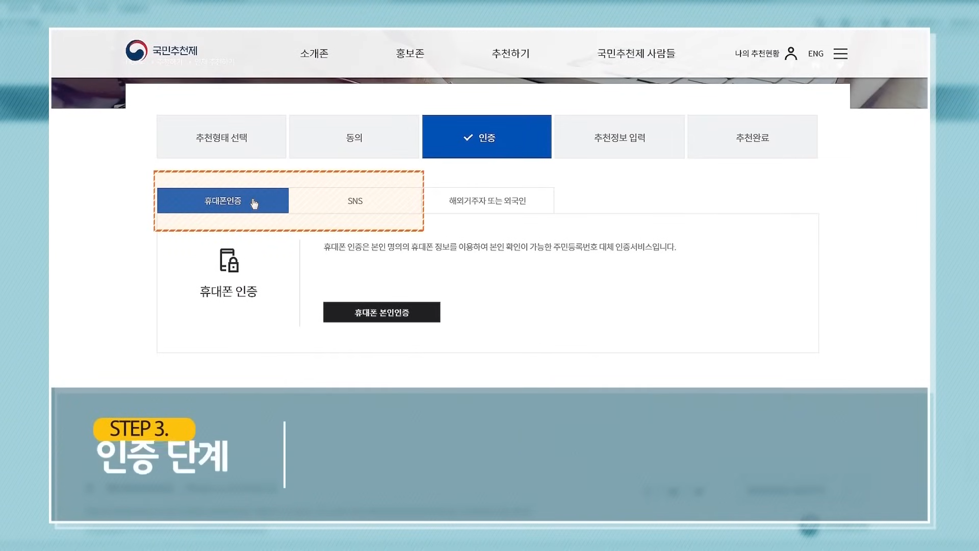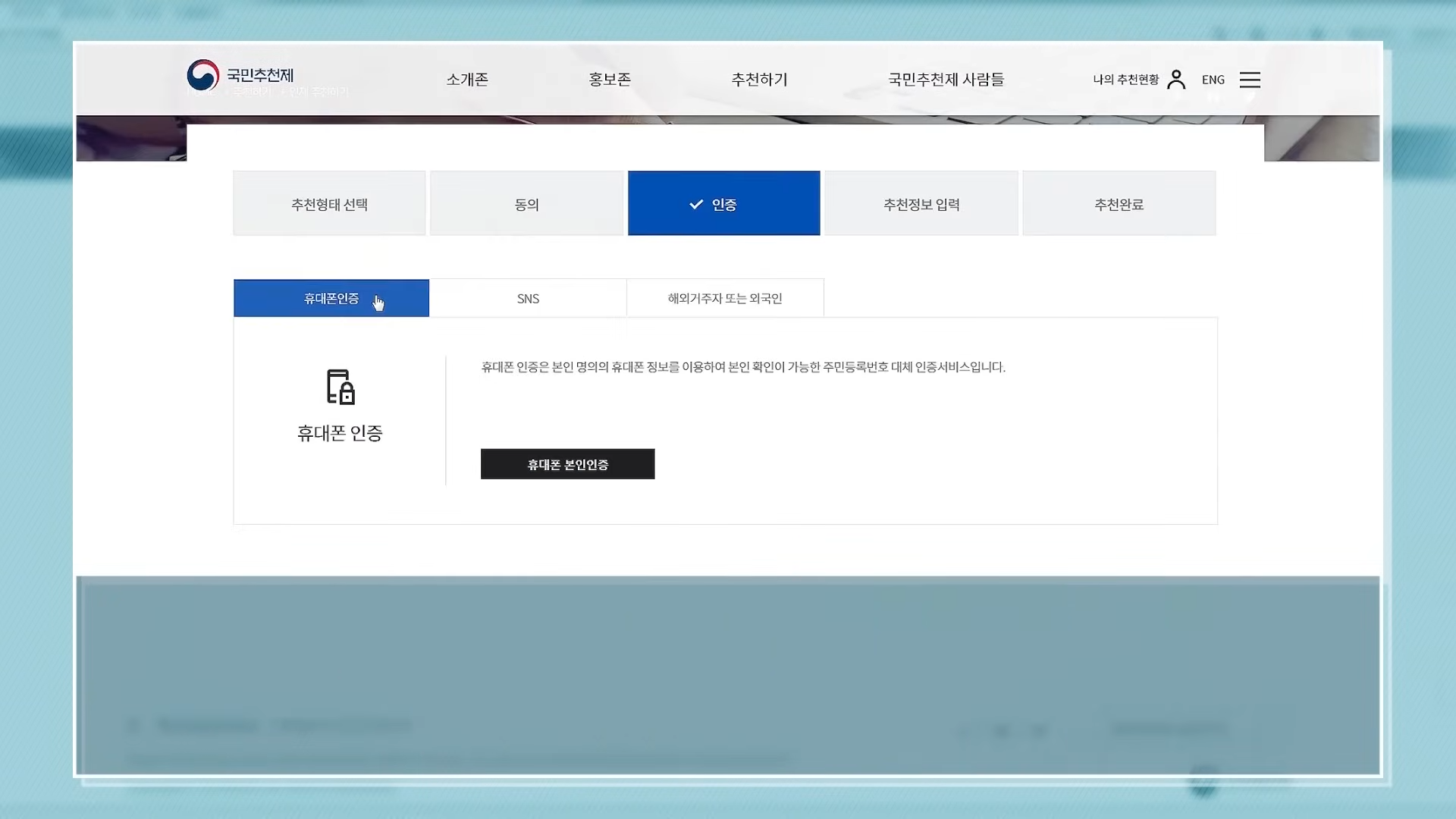 추천을 진행하기 위해서는 본인 인증이 필요합니다. 휴대폰 인증, 공동인증서(구 공인인증서) 등 다양한 인증 방식을 선택해 본인임을 확인합니다. 이 절차는 추천의 신뢰성과 개인정보 보호를 위해 필수적으로 거칩니다.