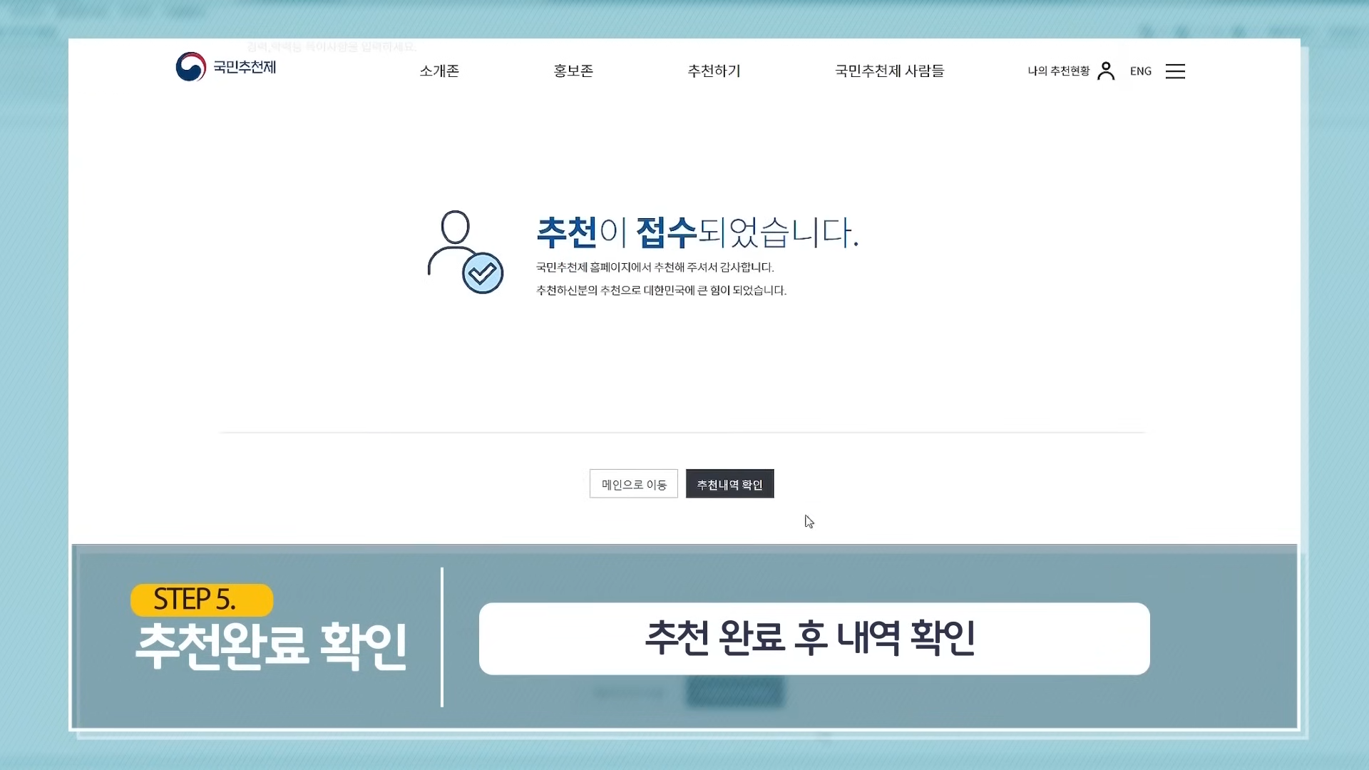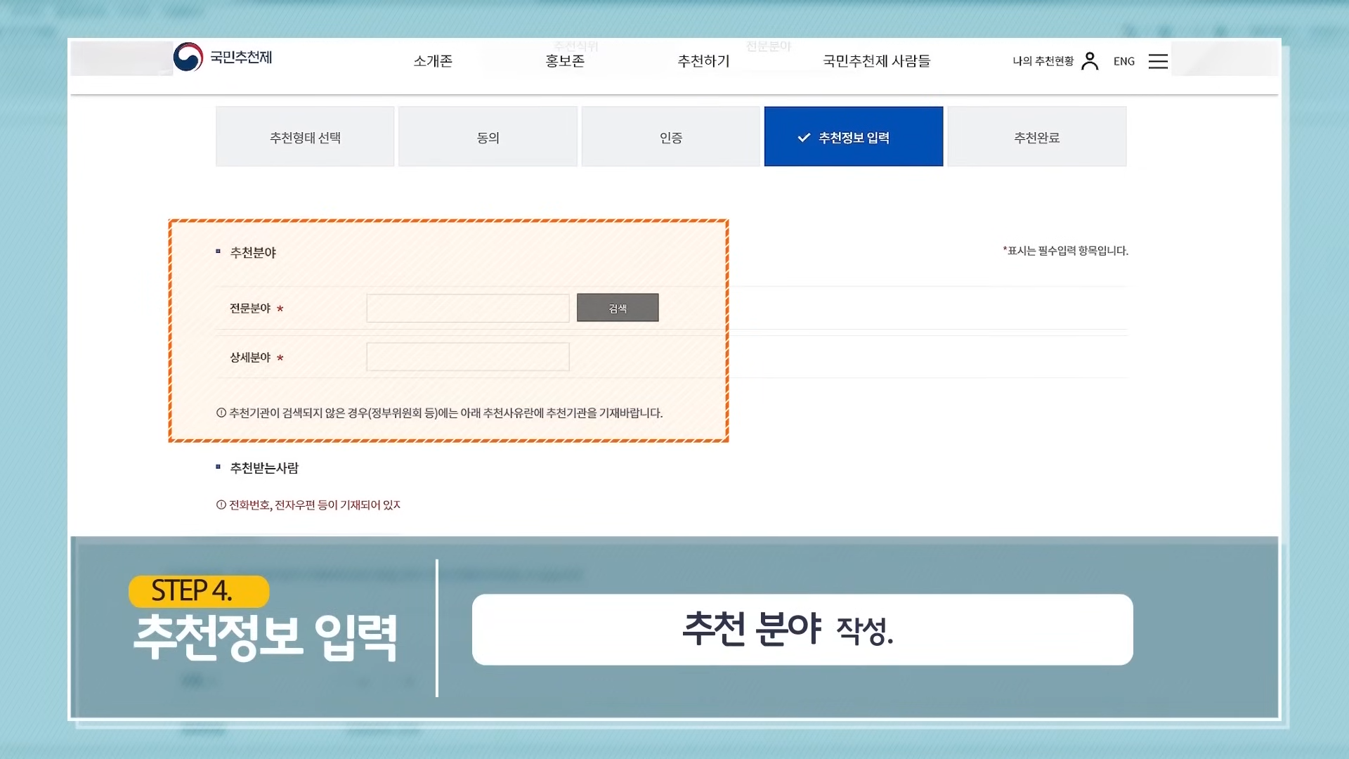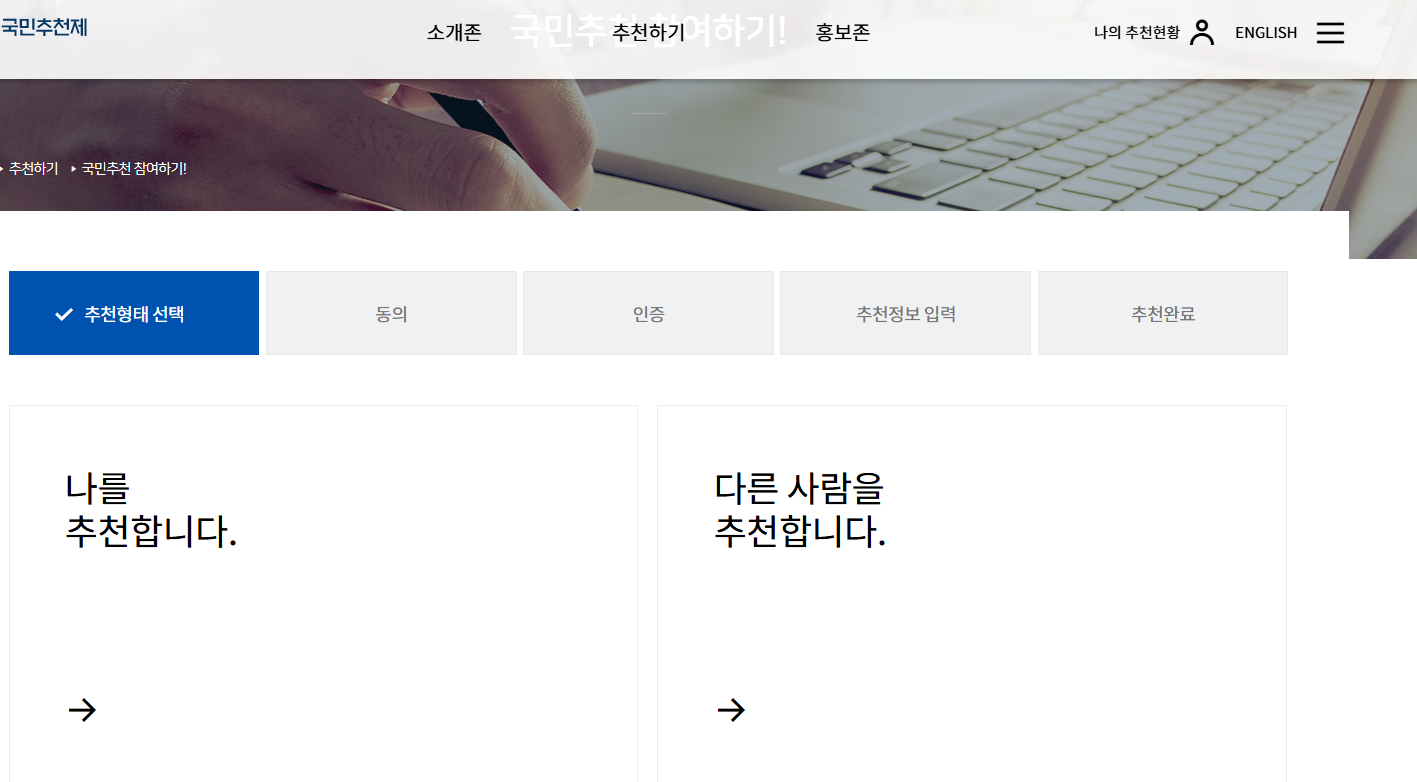 홈페이지 메인 화면이나 상단 메뉴에서 ‘국민추천제’ 또는 ‘추천 참여하기’ 항목을 클릭합니다. 이 메뉴를 통해 온라인 추천 양식 페이지로 이동할 수 있습니다.