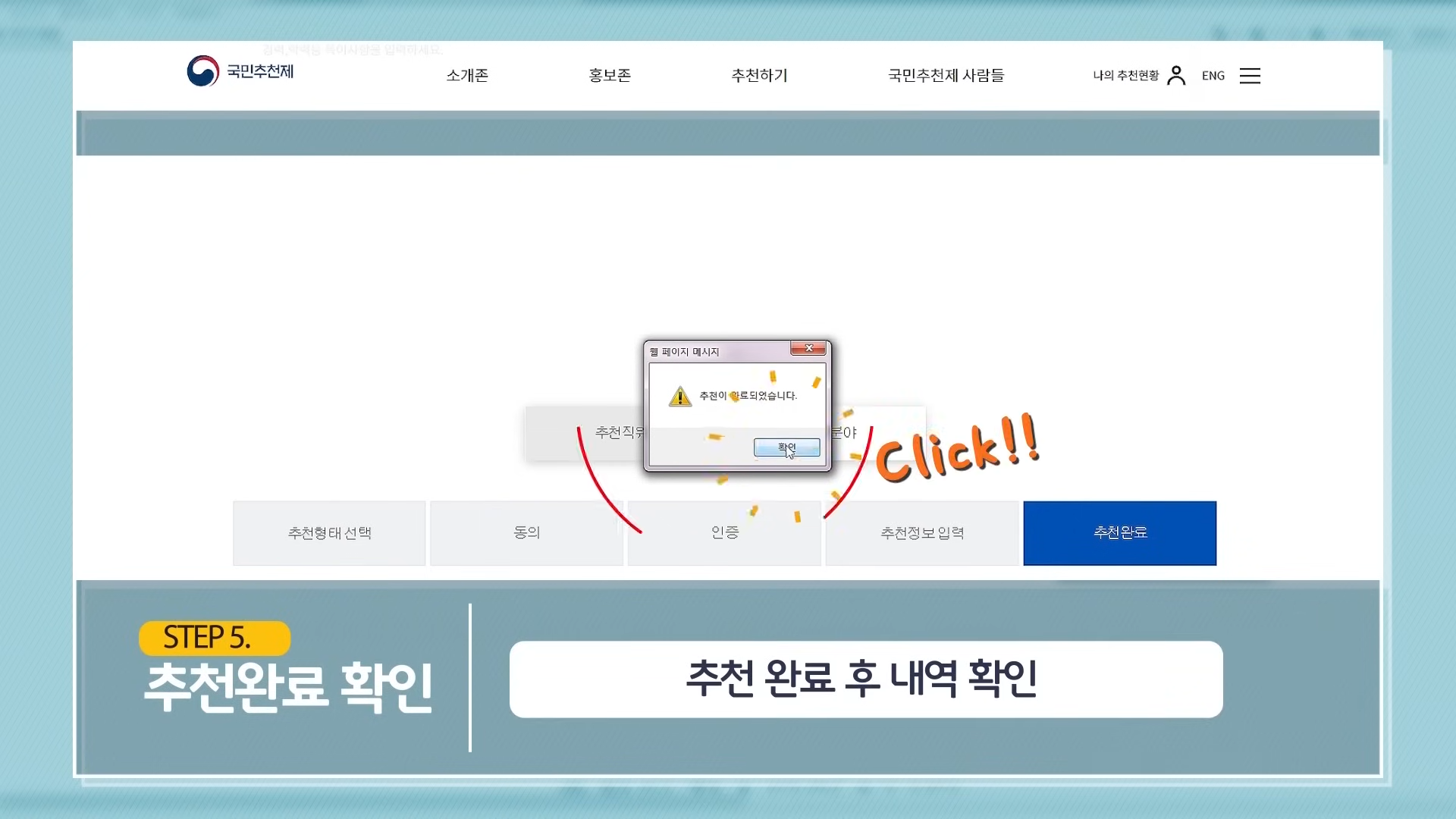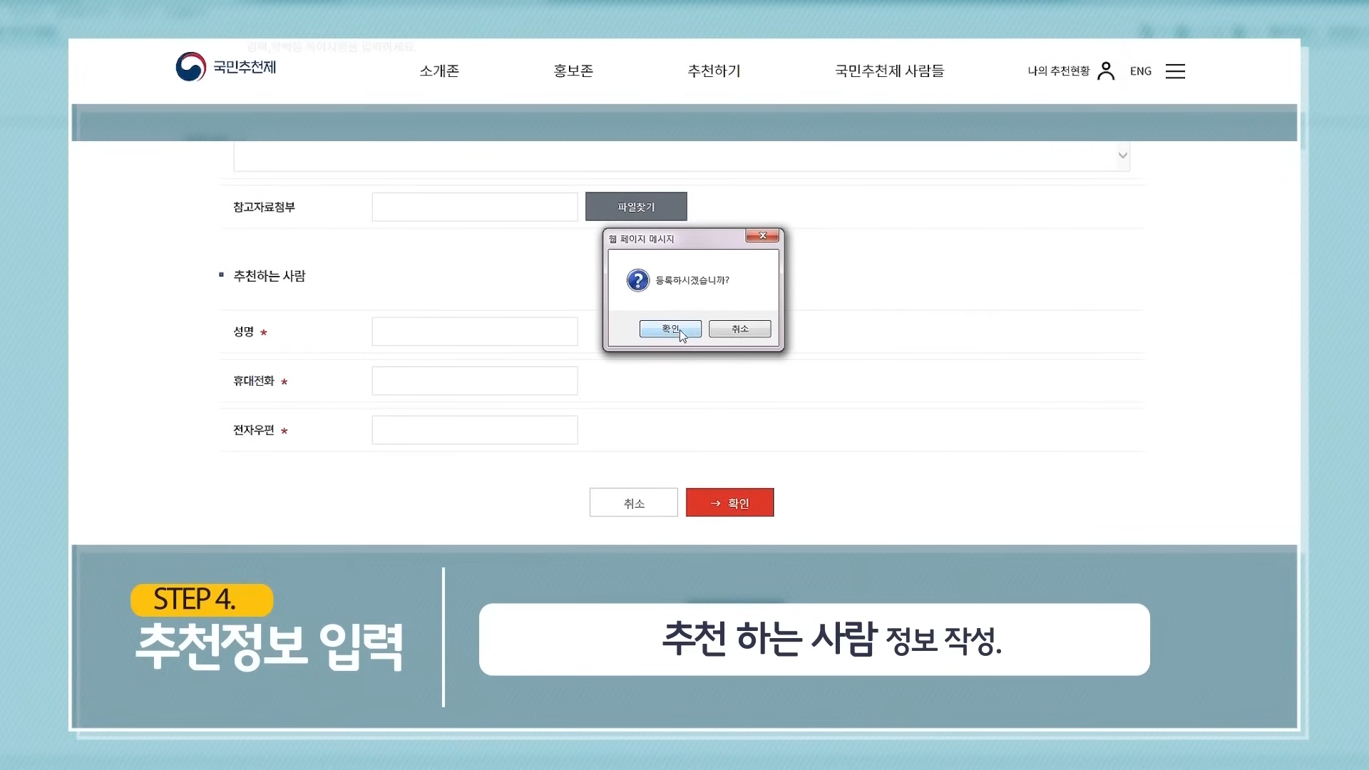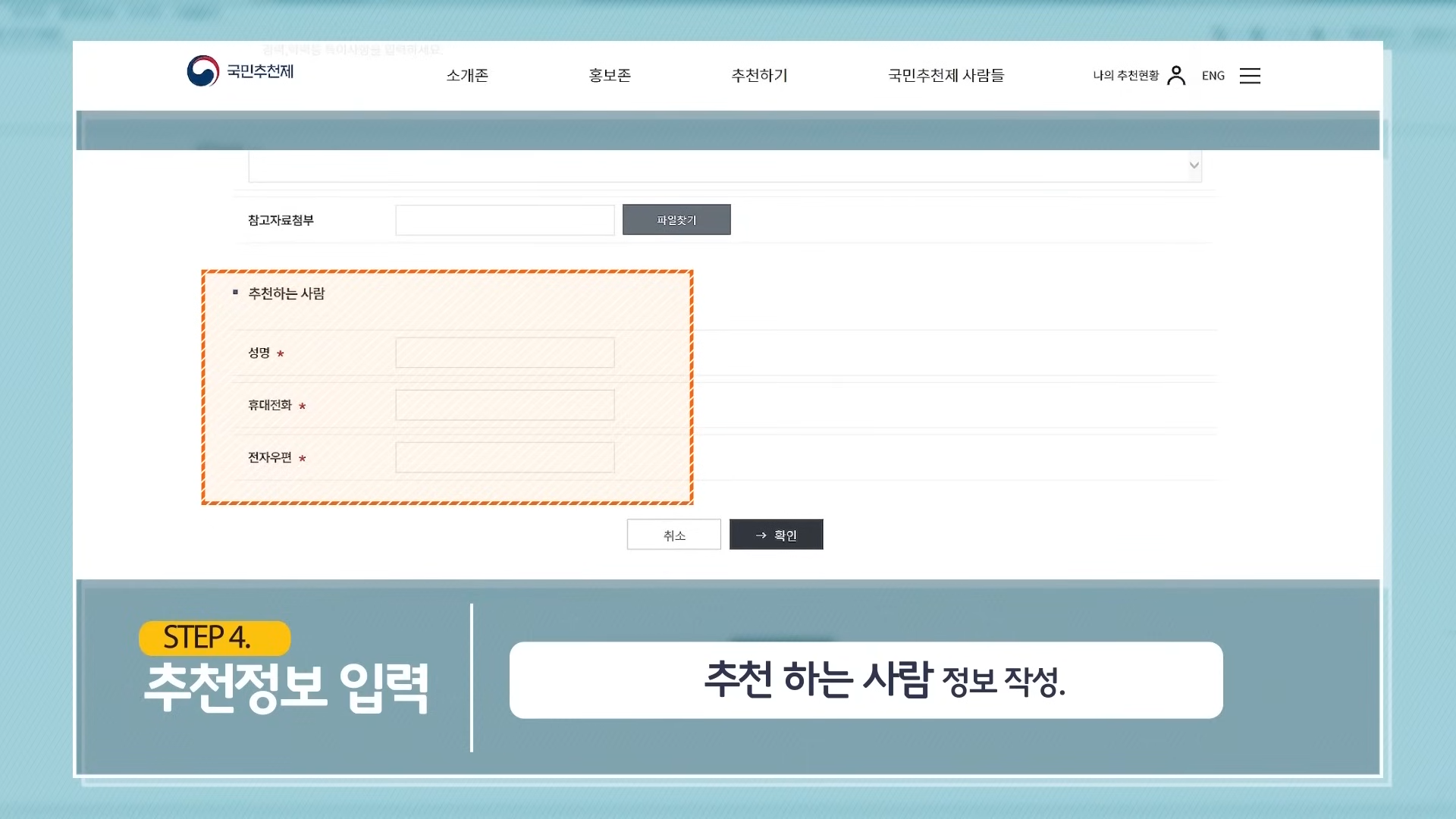 홈페이지 메인 화면이나 상단 메뉴에서 ‘국민추천제’ 또는 ‘추천 참여하기’ 항목을 클릭합니다. 이 메뉴를 통해 온라인 추천 양식 페이지로 이동할 수 있습니다.
