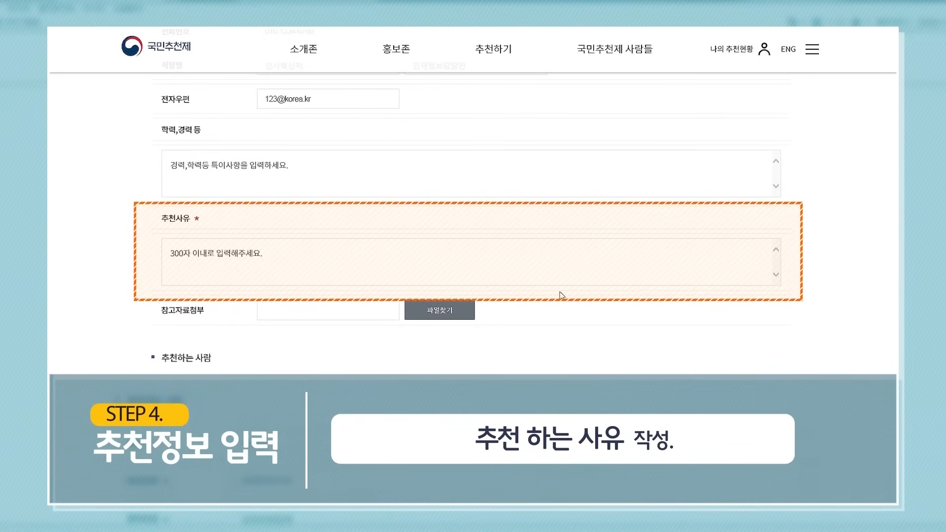 본인 인증 후 추천서 작성 화면이 나타나면, 추천하고자 하는 인재의 인적사항(이름, 연락처, 소속 등)과 추천 사유, 주요 경력 및 업적, 해당 분야의 전문성 등을 구체적으로 기입합니다. 추천인은 본인 또는 타인 모두 가능합니다. 추천 대상자는 사회 각 분야에서 전문성과 역량을 갖춘 인재라면 누구나 해당됩니다.