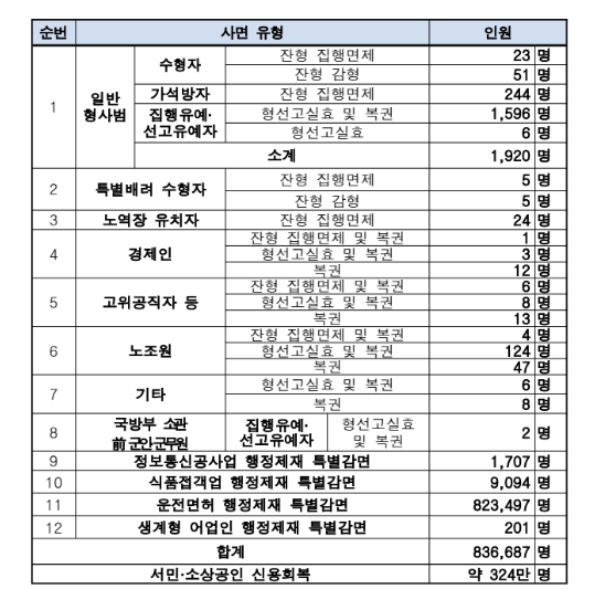 다음으로 홍문종 전 새누리당 의원, 심학봉 전 의원, 은수미 전 성남시장, 윤건영 의원, 백원우 전 의원, 김은경 전 환경부 장관, 문형표 전 보건복지부 장관 등 여야 전·현직 정치인과 전직 고위공직자들이 다수 포함되었습니다. 총 2,188명에 대해 특별사면과 복권이 단행되었으며, 행정제재 대상자 83만여 명에 대한 특별감면도 함께 이뤄졌습니다.