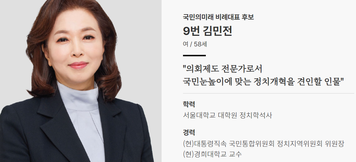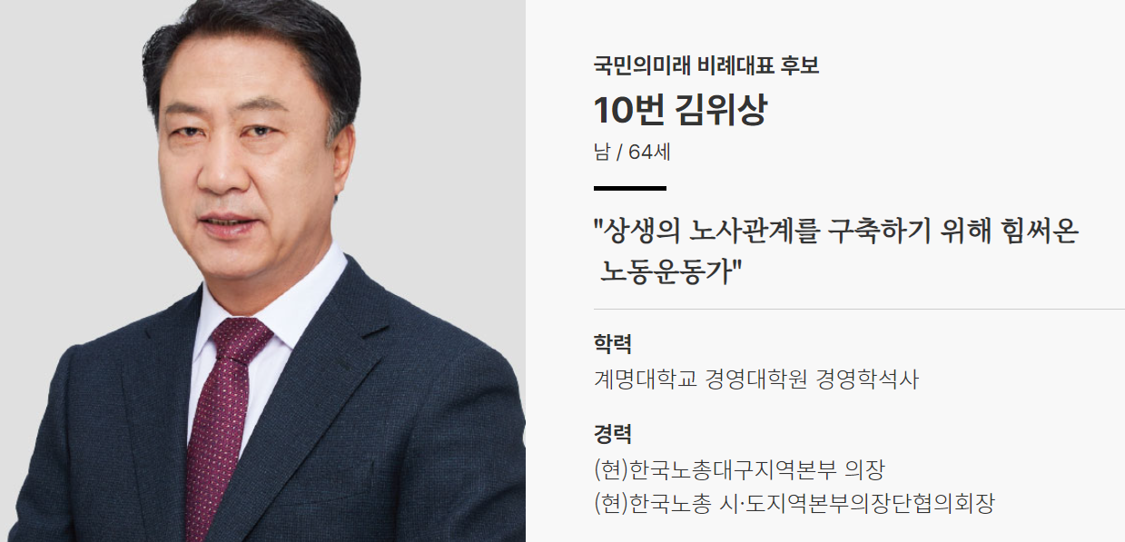비례 9번은 김민전이며 58세로 경희대 교수로 재직하였습니다. 비례 10번은 김위상이며 64세로 한국노총대구지역본부 의장을 지냈습니다.