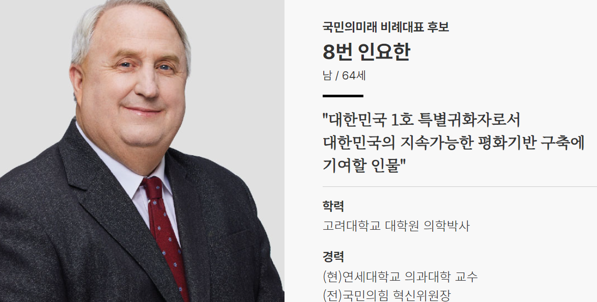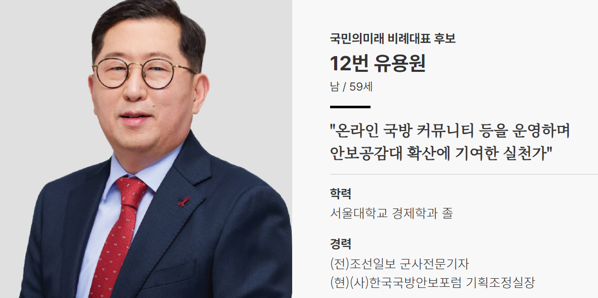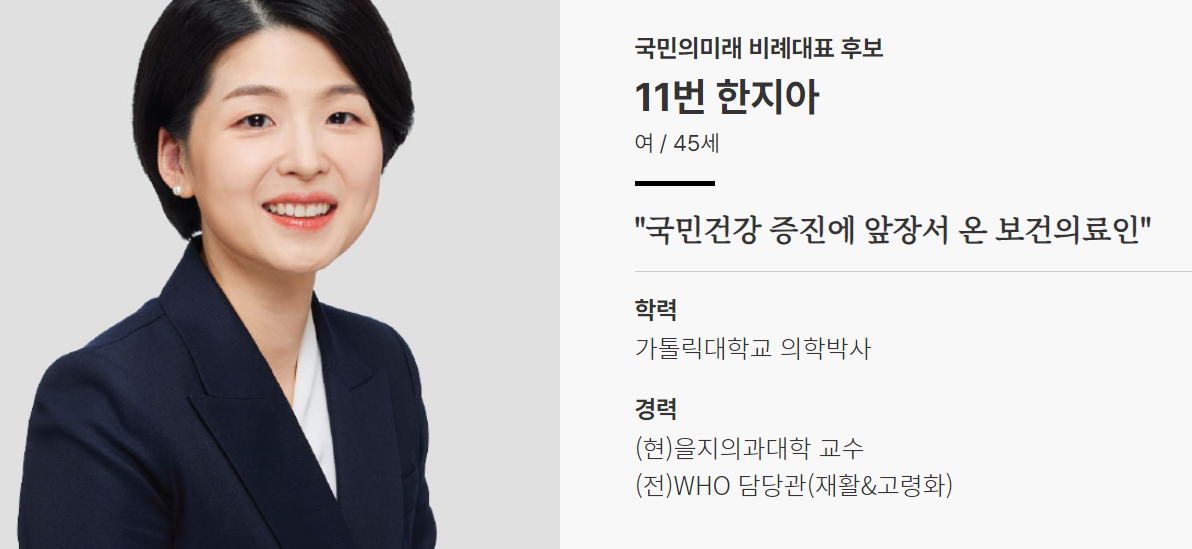 비례 11번은 한지아이며 45세로 을지의과대학 의정부을지대학교병원 재활의학과 부교수로 재직하였습니다. 비례 12번은 유용원이며 59세로서 전 조선일보 기자이자 국가보훈부 정책자문위원등을 맡았습니다.