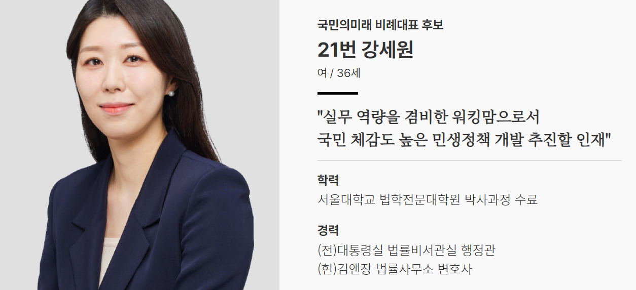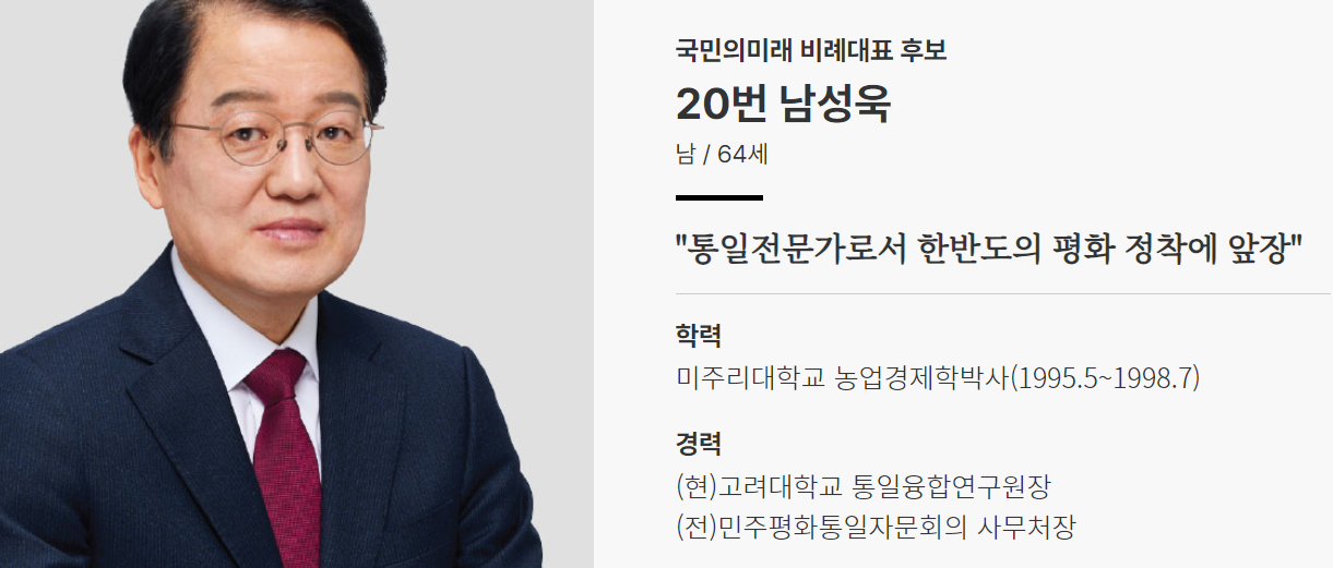 비례 20번은 남성욱이며 64세로 고려대 행정전문대학원 교수를 지냈습니다. 비례 21번은 강세원이며 36세로 전 대통령실 법률비서관실 행정관 출신입니다. 13번에서 21번으로 순번이 재 배정되었습니다.