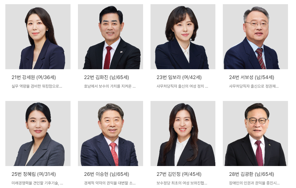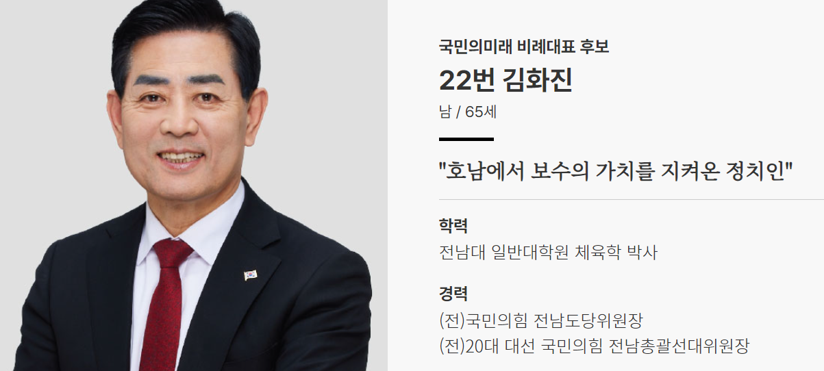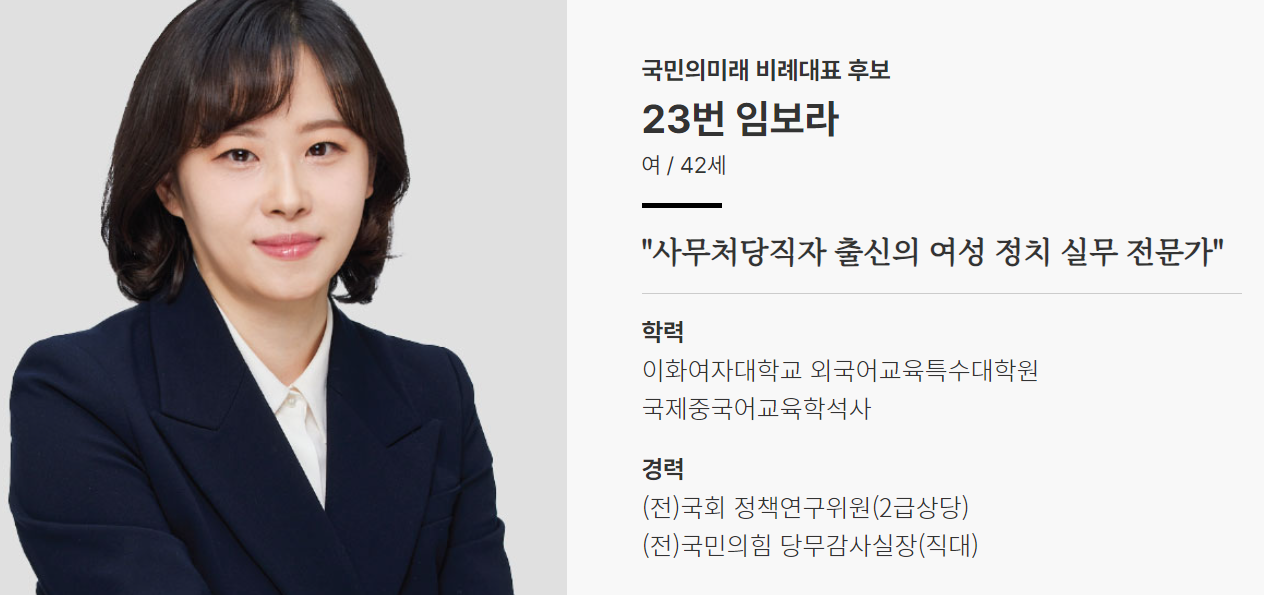 비례 22번은 김화진이며 65세로 전 국민의힘 전남도당위원장입니다. 비례 23번은 임보라이며 42세로 전 국민의힘 당무감사실장을 지냈습니다.
