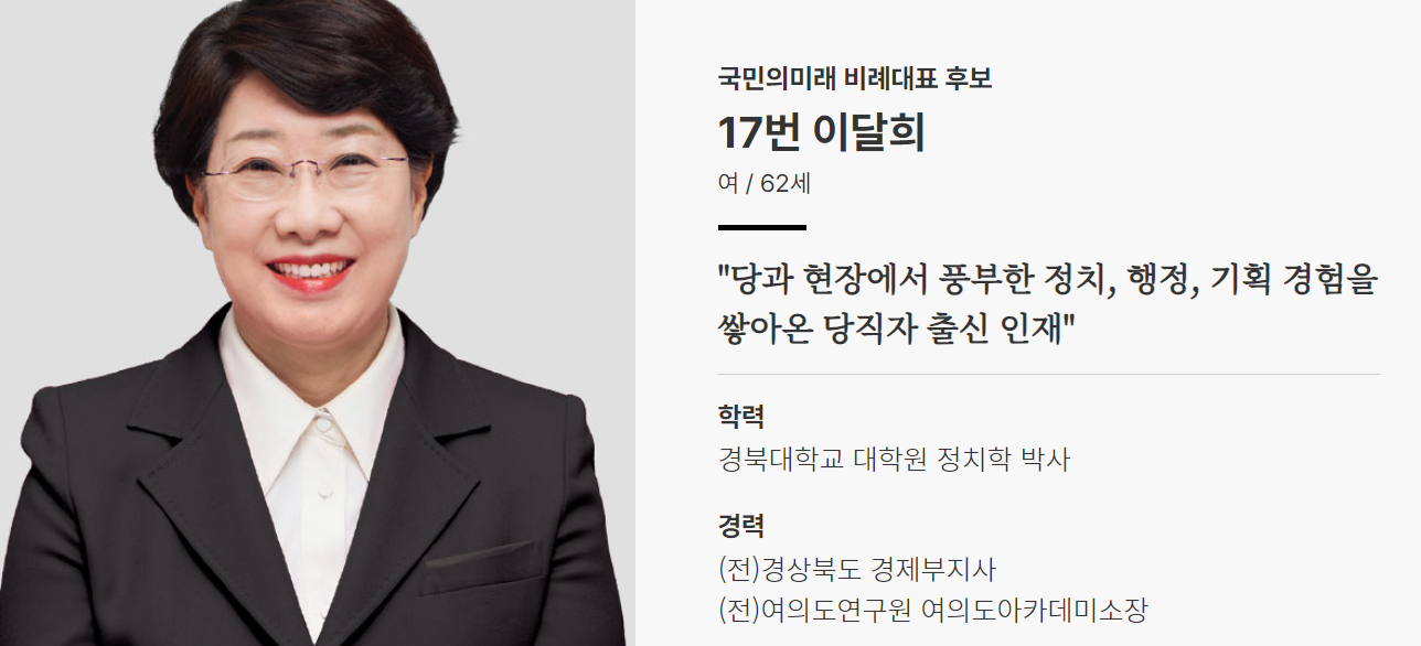 비례 17번은 이시우이며 전 국무총리비서실 공보실 서기관은 비례공천이 취소되었으며 당직자 출신의 이달희 전 경상북도 경제부지사가 배치되었습니다.