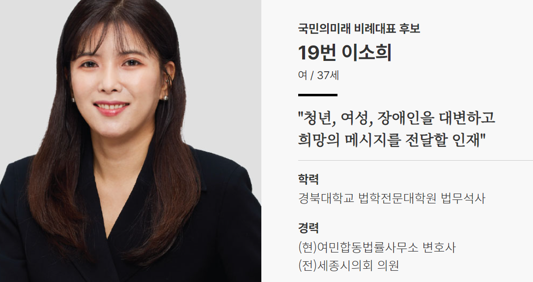 비례 1번은 최보윤이며 45세로서 한국장애인 고용공단 인권경영위원등을 맡았습니다. 비례 2번은 박충권이며 38세로 현대제철 책임연구원등을 맡았습니다.