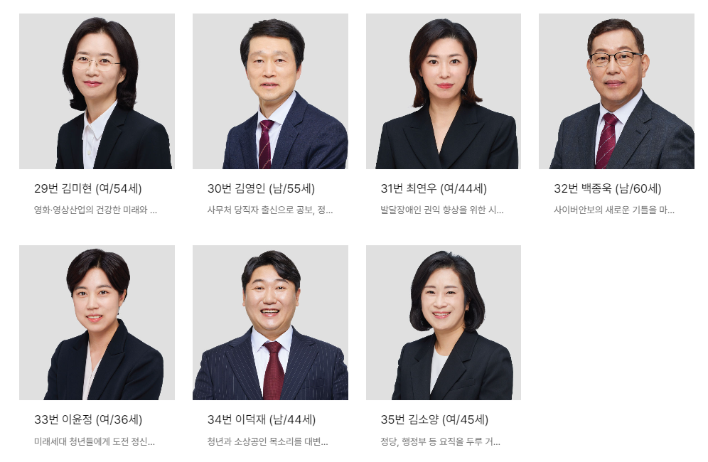 이후 24번부터 순차적으로 서보성 전 국민의힘 대구시당 사무처장, 정혜림 전 SK경제경영연구소 연구원, 이승현 한국영상제작협동조합 이사장,