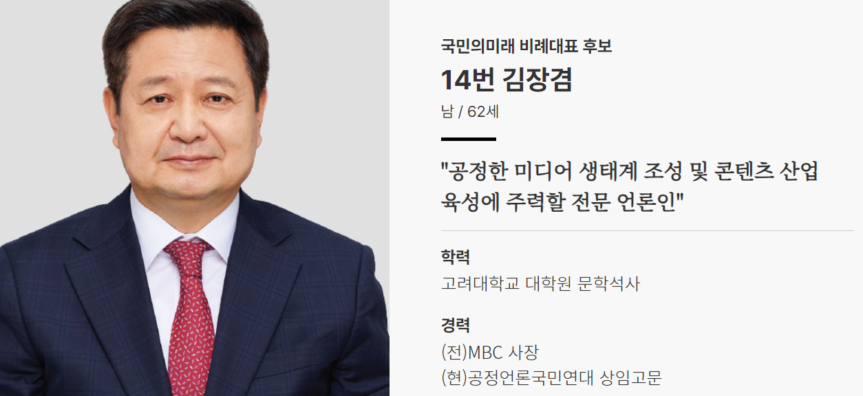 비례 13번은 강세원 전 대통령실 법률비서관실 행정관 에서 조정을 통해 전북 출신 3선 조배숙 전 의원을 배치하면서 변경되었습니다. 비례 14번은 김장겸이며 62세로 전 MBC 사장으로 재직한바 있습니다.