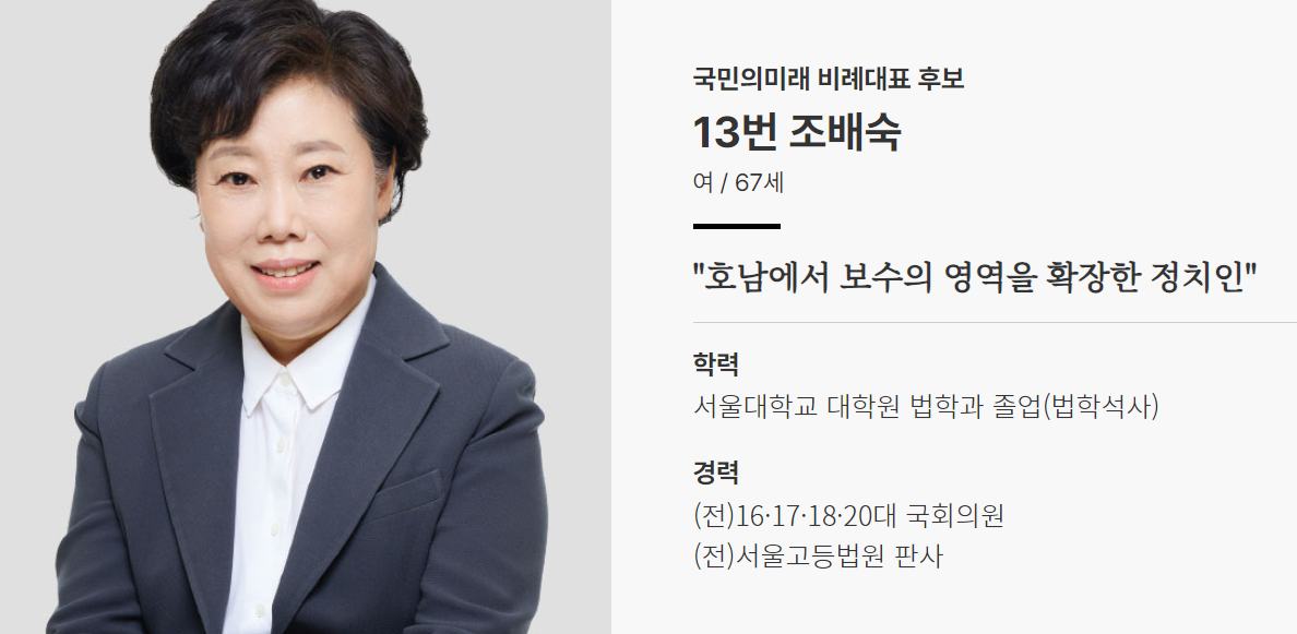 호남 지역 국민의힘 후보들이 집단 사퇴등이 발생하고 반발하였으며 컷오프 되었던 조배숙 전 의원이 13번으로 변경되었습니다.