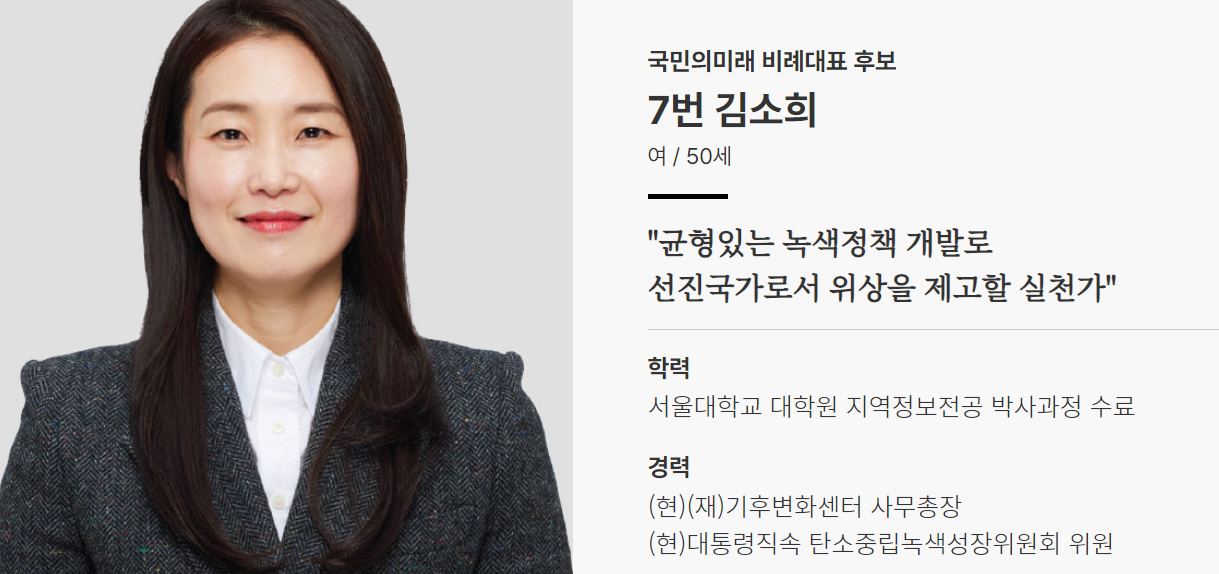 비례 7번은 김소희이며 50세로서 기후변화센터 사무총장등을 지냈습니다. 비례 8번은 인요한이며 64세로 전 국민의힘 혁신위원장이자 세브란스병원 국제진료소 소장등을 맡았습니다.