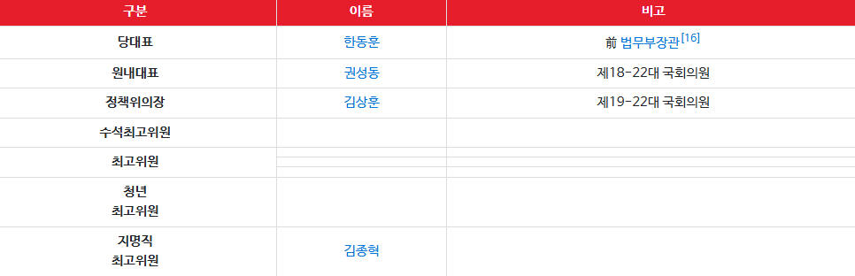 최고위원들이 사퇴함에 따라서 포스팅을 작성하는 현 시점 기준으로 당대표는 한동훈 이며 국민의힘 원내대표 권성동 국회의원, 정책위의장 김상훈 국회의원, 지명직 최고위원에는 기자 출신 정치인 김종혁이 남아 있습니다.
