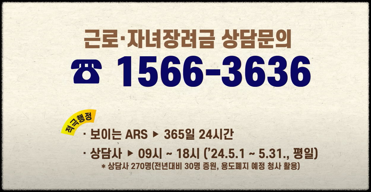 또다른 방법으로 신분증 지참 후 가까운 세무서 방문하여 문의하시거나 장려금 상담센터 1566-3636으로 전화하여 조회해 보는 방법도 있습니다.