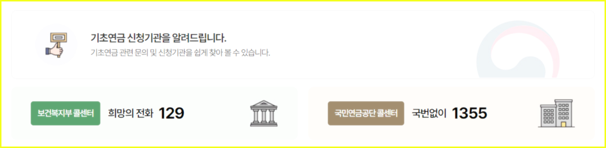 기타 이와 관련된 문의나 질의가 필요하신 분들은 보건복지부 대표전화인 129번 혹은 국민연금공단 1355번 그리고 지역 주민센터, 복지 담당자등에 문의하시기 바랍니다.