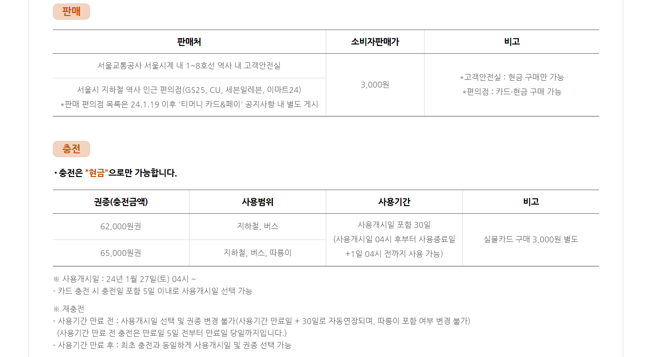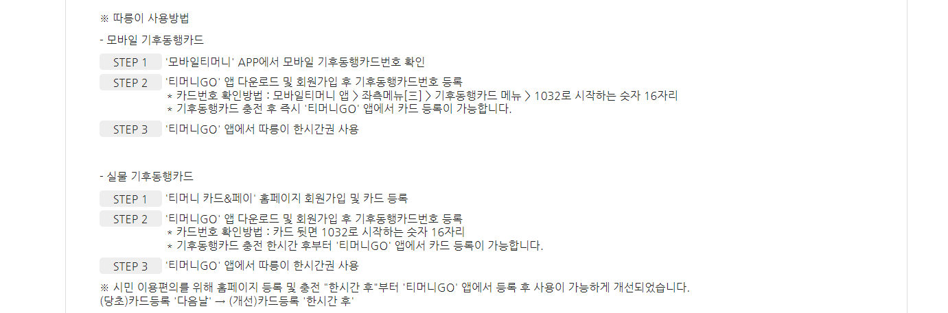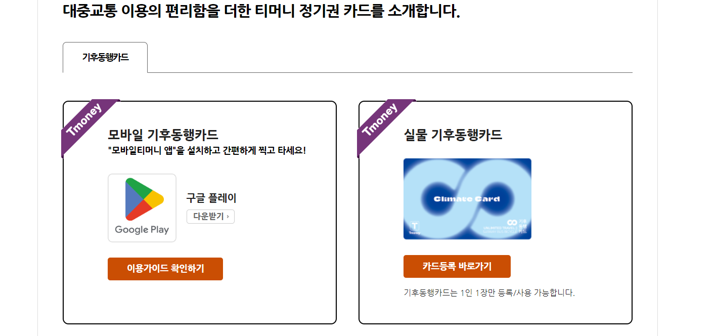 단 실물카드로 이용하시려면 티머니 홈페이지에 카드 등록이 필요하며 이후 매달 충전을 통해 사용할 수 있습니다.