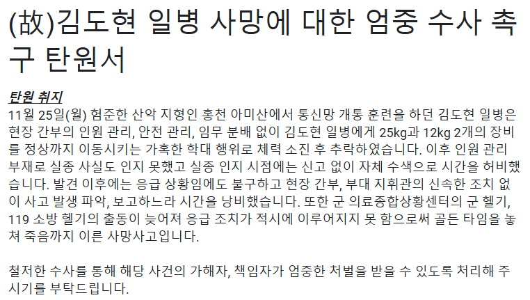 2024년 11월 25일, 강원도 홍천군 서석면 아미산에서 훈련 중이던 제20기갑여단 53포병대대 소속 김도현 일병이 안타깝게 목숨을 잃었습니다.