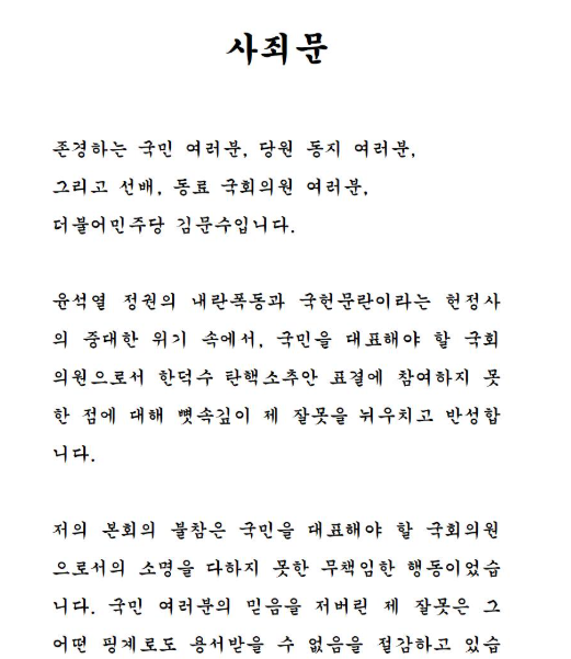 이에 이재명 대표는 김 의원을 윤리심판원에 회부하여 조사를 지시하였습니다. 논란이 확산된 같은 날 오후, 김 의원은 본인의 페이스북을 통해 사죄문을 게시하였습니다.