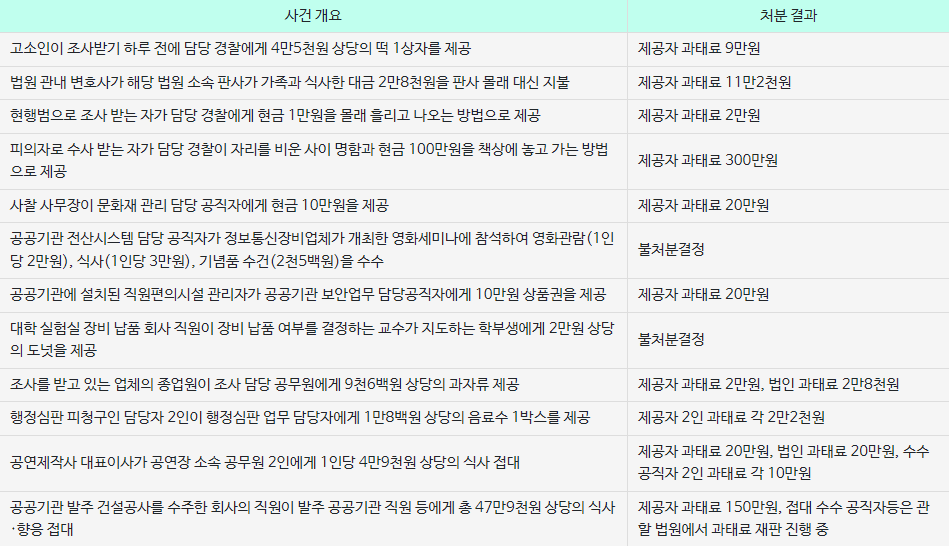 다만, 원활한 직무수행, 사교·의례 또는 부조의 목적으로 제공되는 5만 원 이하의 선물(농수산물 및 농수산가공품은 10만 원)이나 3만 원 이하의 식사(2023년 8월 27일부터 5만 원으로 상향), 10만 원 이하의 경조사비 등은 예외적으로 허용됩니다.