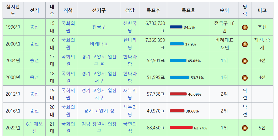 5선(제15대, 제16대, 제17대, 제18대, 제21대)
