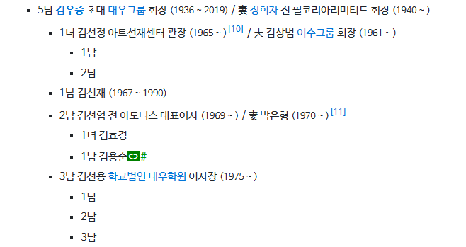 김우중 회장은 1989년에 저서인 세계는 넓고 할 일은 많다를 출간하기도 했습니다. 그의 가족으로는 부인 정희자 여사와 3남 1녀가 있으며, 장녀 김선정, 장남 김선재, 차남 김선협, 삼남 김선용이 있습니다.