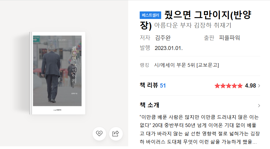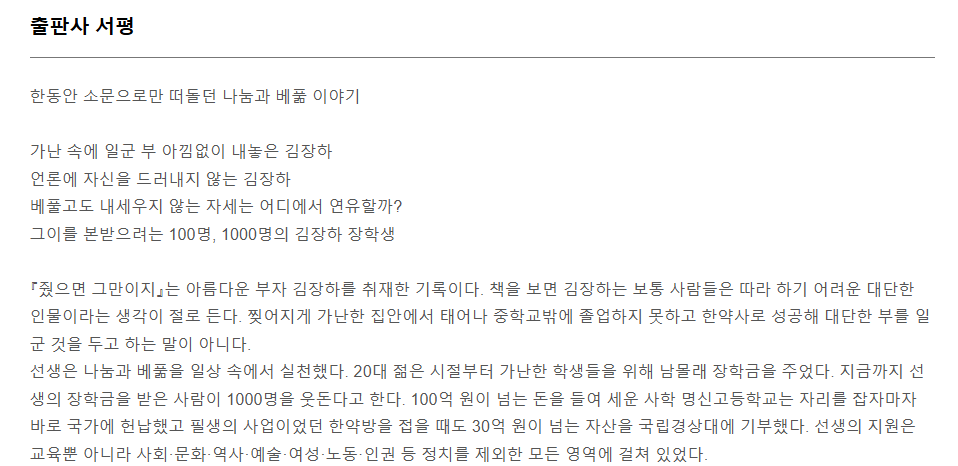 줬으면 그만이지: 아름다운 부자 김장하 취재기 (김주완 저, 피플파워, 2023): 김장하 선생의 삶과 철학, 나눔의 정신을 깊이 있게 다룬 취재 기록입니다.