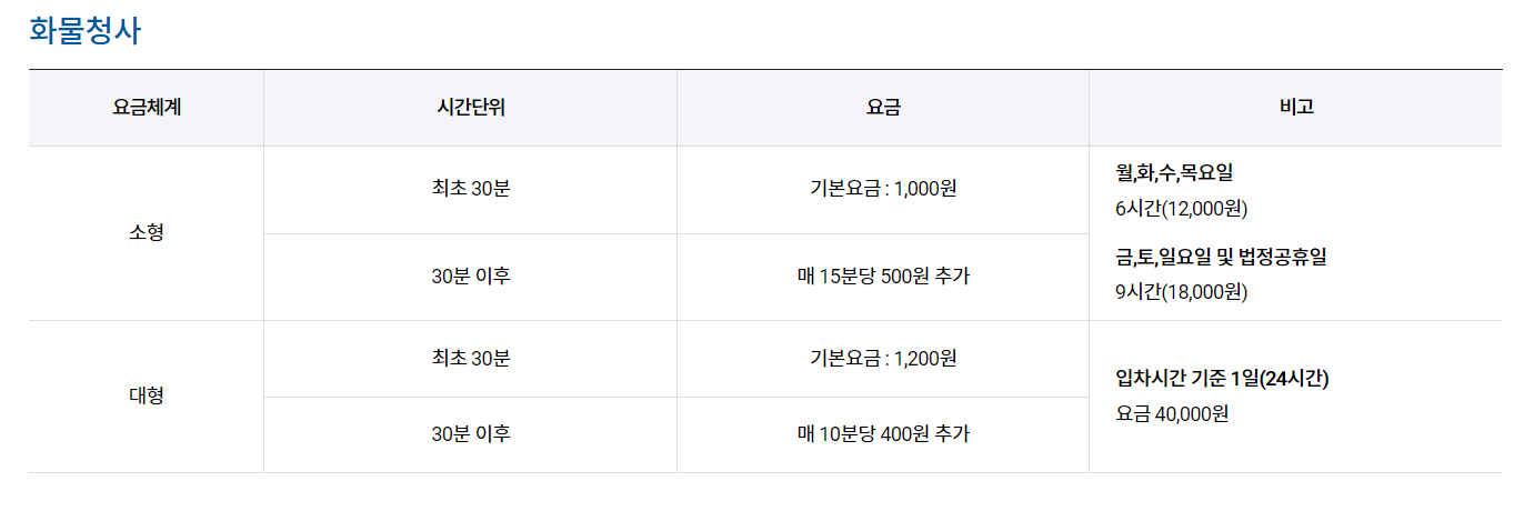 화물청사의 경우 소형이나 대형이냐에 따라서 구별됩니다. 요금은 아래와 같습니다.