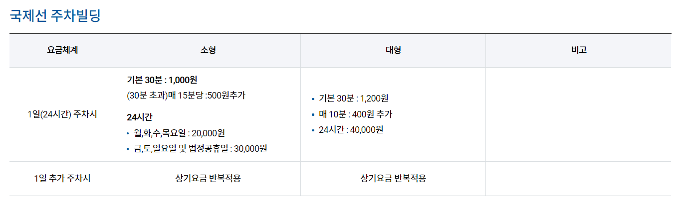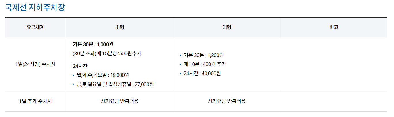 국제선 지하주차장에서는 소형과 대형 주차가 가능합니다. 소형의 경우 기본 30분 1,000원에 30분 초과시에 매 15분당 500원 의 요금이 추가되고 있습니다.