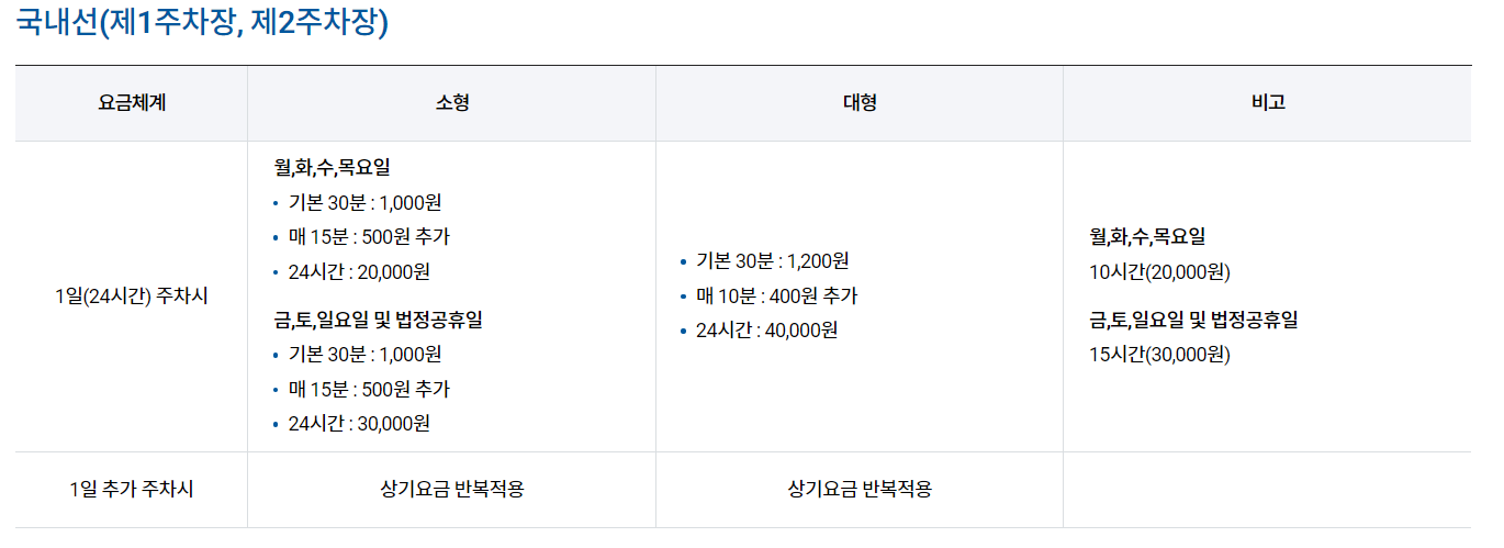 국내선의 제1주차장, 제2주차장요금을 살펴보겠습니다. 크게 소형, 대형, 장시간 주차등으로 구별됩니다. 이용 요금은 다음과 같습니다.
