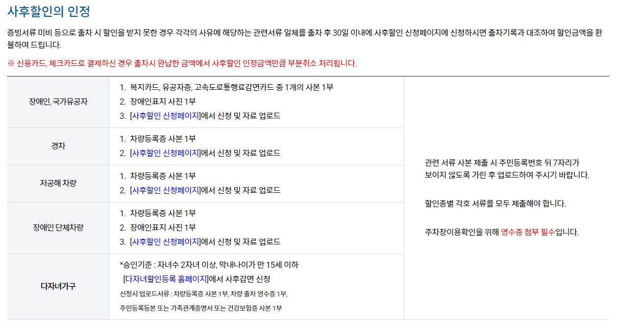 참고로 과거에는 주차요금 사후 할인이 불가능했지만 지금은 증빙서류 미비로 할인을 받지 못한 경우에 출차 후 30일 이내에 할인신청서를 제출하면 할인금액을 돌려받을 수 있습니다.