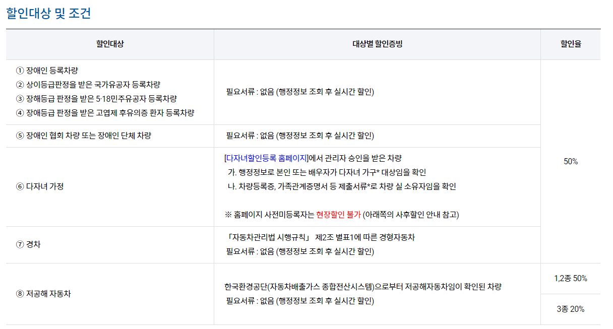 할인 대상에는 다음과 같은 분들이 포함됩니다. 장애인, 국가유공자, 5·18민주유공자, 고엽제 후유의증 환자, 다자녀 가정, 경차 소유자, 저공해 자동차 소유자등입니다.