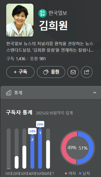 김희원 기자는 4년 넘게 '김희원 칼럼'을 연재하며 진보와 보수 진영 논리에 휘둘리지 않고 날카로운 시각으로 사회를 분석해 왔습니다. 그녀는 '시대의 균형추' , '날카로운 비판자' 라는 별명처럼 언론의 사명을 잊지 않고 끊임없이 스스로를 되돌아보며 글을 씁니다.