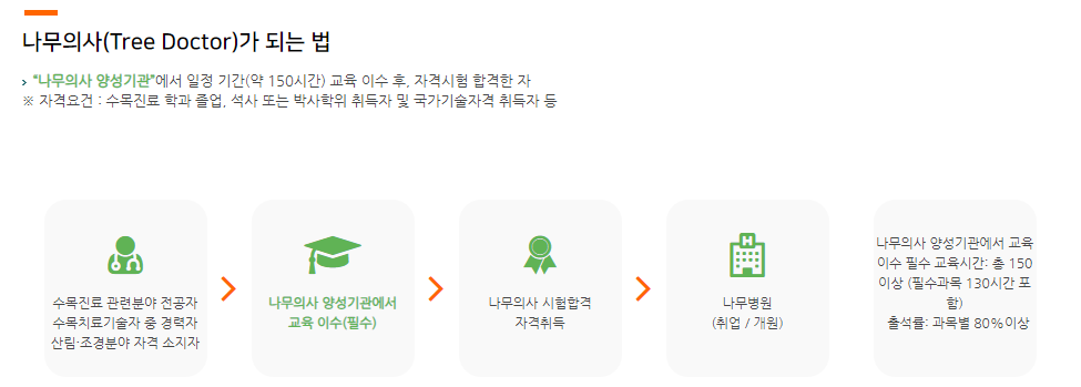 또한, 150시간 이상의 나무의사 교육을 이수해야 자격 시험에 응시할 수 있습니다. 물론 나무의사 자격을 취득하려면 다양한 경로를 통해 응시자격을 갖출 수 있습니다. 학력, 자격증, 실무경력 등 여러 기준을 충족하면 나무의사 시험에 응시할 수 있습니다.