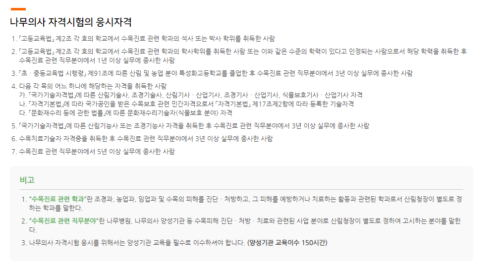 이처럼 다양한 학력, 자격, 실무 경력을 통해 나무의사 시험에 도전할 수 있으니, 자신에게 맞는 경로를 선택하여 준비하시길 바랍니다.