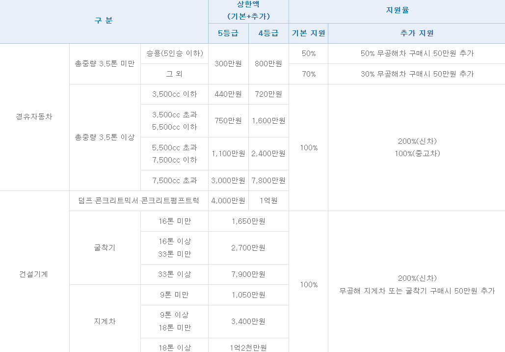 3.5톤 이상 기준으로 4등급 720만원에서 최대 1억 그리고 5등급은 440만원에서 4천만원까지 보조되며 상한액 지급기준은 중고는 100% 그리고 신차는 200%지원이 됩니다.