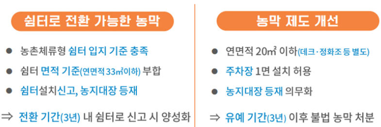 마지막으로, 기존의 불법 농막도 농촌체류형 쉼터로 전환될 수 있으며, 이 경우에는 유예 기간 내에 설치 절차를 이행해야 양성화가 가능합니다.