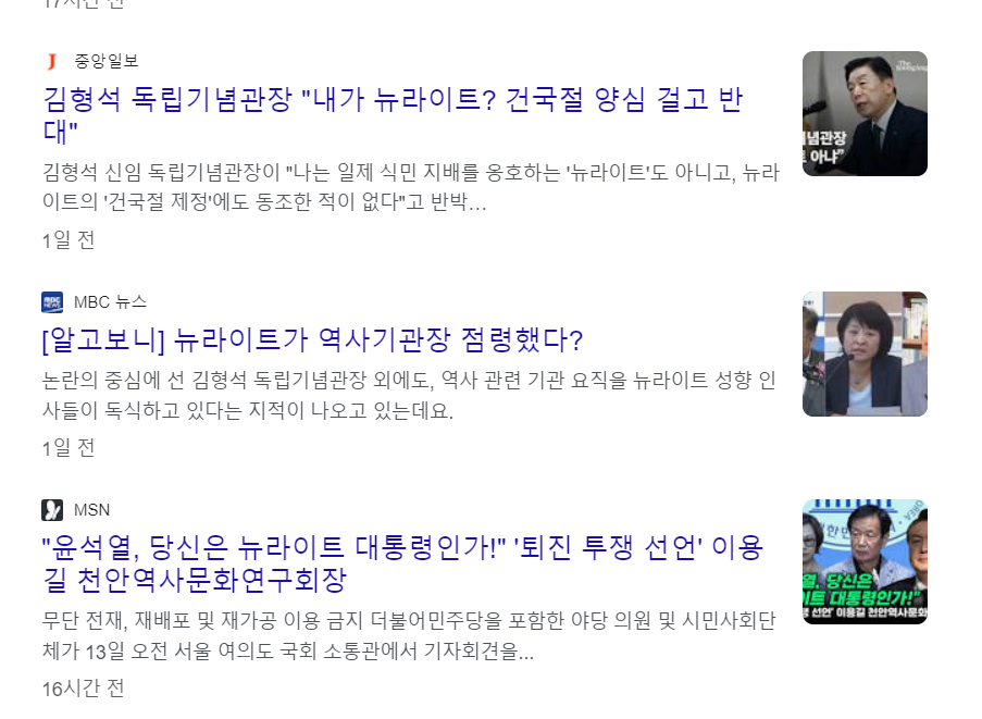2024년 8월, 김형석 독립기념관장 임명 논란을 계기로 윤석열 정부의 역사 관련 기관 뉴라이트 인사 대거 임명 논란이 있었습니다.