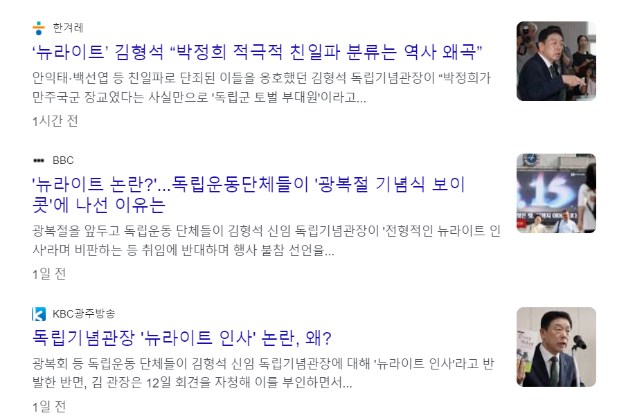 2024년 8월, 김형석 독립기념관장 임명 논란을 계기로 윤석열 정부의 역사 관련 기관 뉴라이트 인사 대거 임명 논란이 있었습니다.