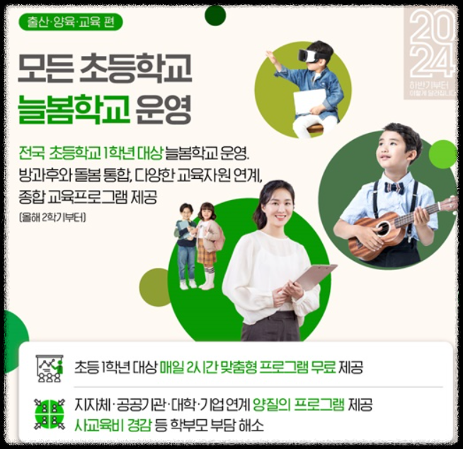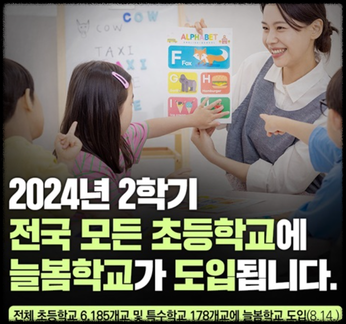 특히, 2023년 8월 14일부터 전국 초등학교 6,185개교 및 특수학교 178개교에 늘봄학교가 도입되었으며, 희망하는 모든 초등학교 1학년 학생들이 참여할 수 있도록 지원하고 있습니다.