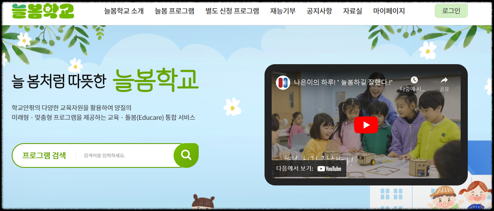 늘봄학교는 기존의 초등학교 방과후 프로그램과 돌봄교실을 통합하여 새롭게 개선된 교육 및 돌봄 시스템으로, 정규 수업 이외의 시간에 학생들의 성장과 발달을 지원하기 위해 학교와 지역사회의 다양한 교육 자원을 연계하여 종합적인 교육 프로그램을 제공합니다.