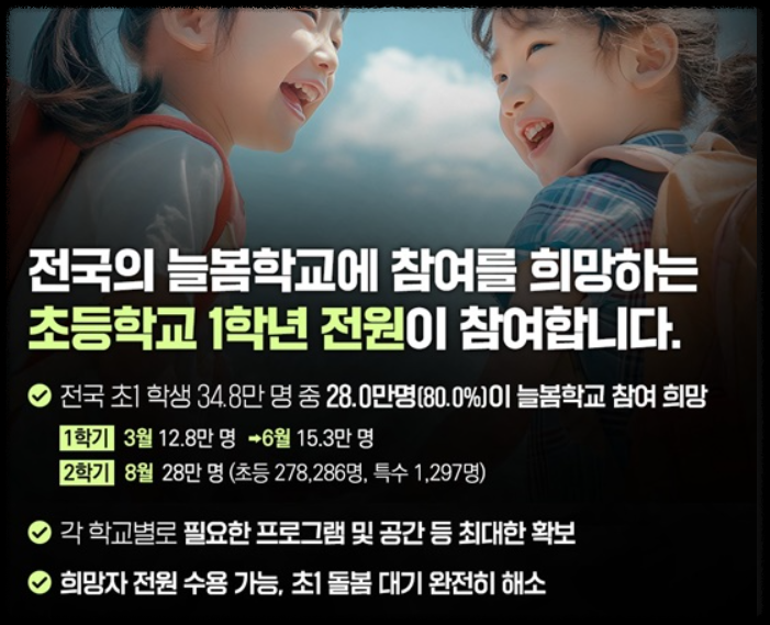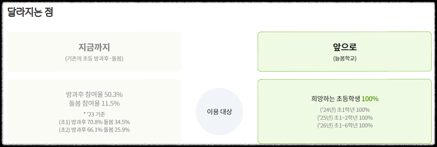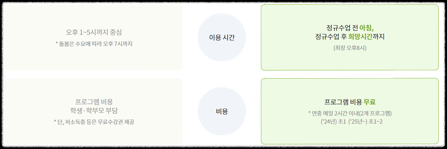 특히, 희망하는 모든 초등학생이 이용할 수 있도록 지원하며, 2024년에는 초등학교 1학년부터 시작하여 점차적으로 모든 학년으로 확대될 예정입니다. 2024년과 2025년에는 다른 학년에게는 기존의 방과후 및 돌봄 프로그램이 제공됩니다.