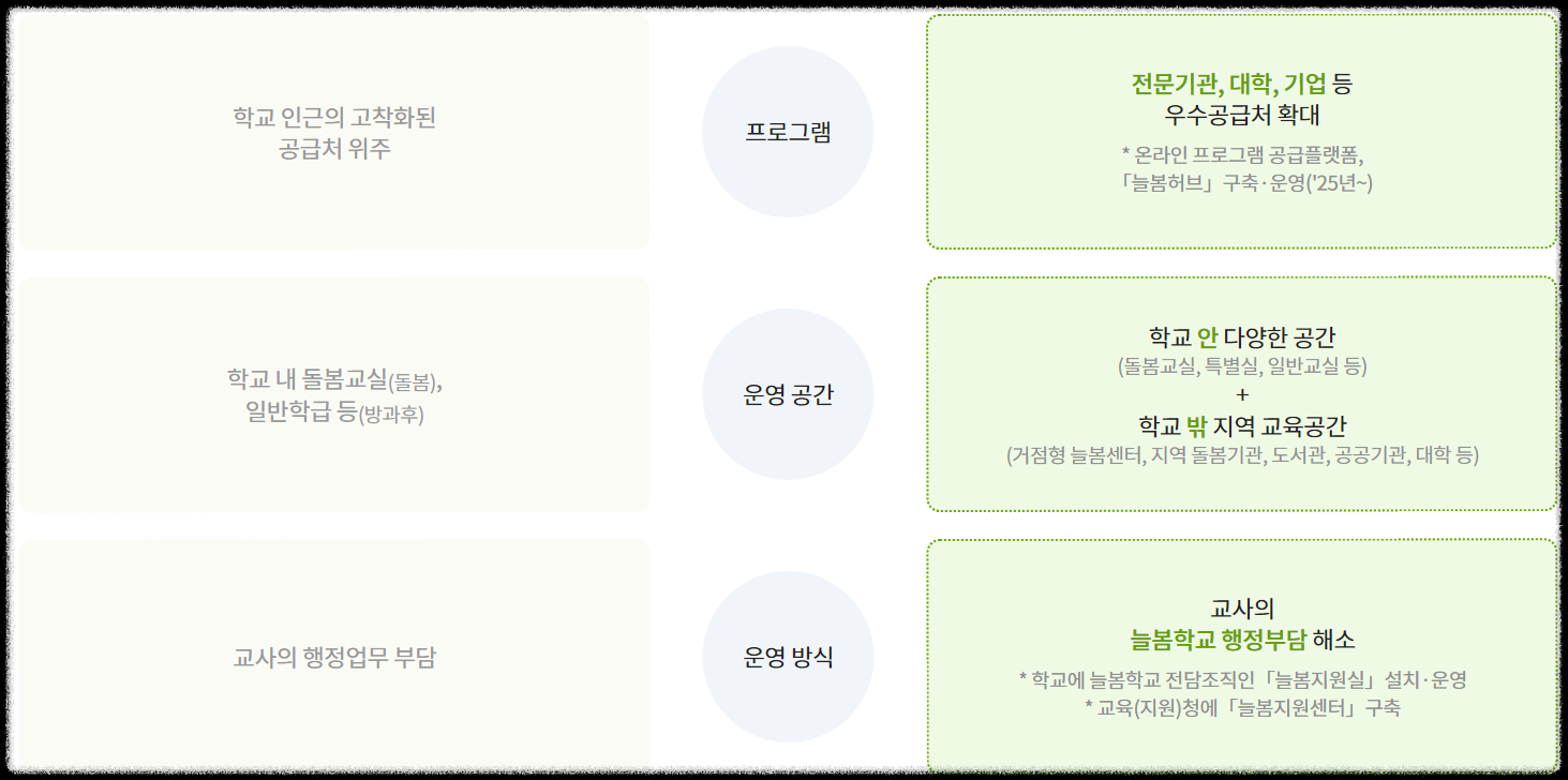 또한, 시도교육청 및 학교별 특성에 맞춰 지자체, 공공기관, 대학, 기업 등과 연계한 프로그램, 수요에 맞춘 아침 및 저녁 늘봄 프로그램, 지역 공간 활용 등 다양한 모델을 확산하여 학생들의 다양한 요구를 충족시키고 있습니다.