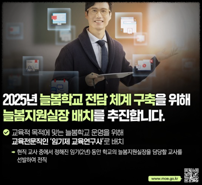 2025년에는 늘봄학교 전담 체계 구축을 위해 늘봄지원실장 배치를 추진하며, 교육적 목적에 맞는 늘봄학교 운영을 위해 교육전문직인 '임기제 교육연구사'로 배치할 예정입니다.